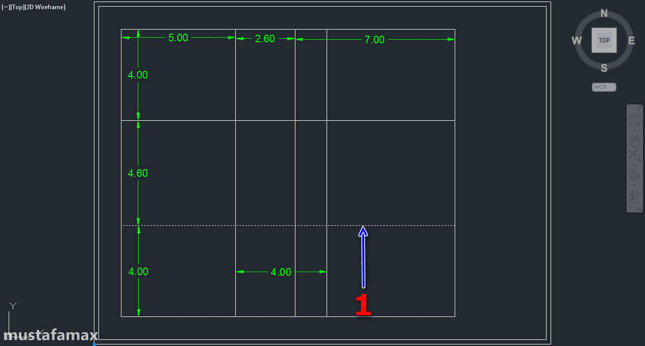 لماذا عملت هكذا هذا الطريقة تتيح لك معرفة مساحة العمل بسرعة غرف النوم 5*4 وهذا هو المقاس المعتاد لمنازلنا علما سيأخذ منه سمك الجدار وغرفة الاستقبال 7*4 اربعة الان تقوم بعمل باقي التفاصيل تستخرج المطبخ ويكون بجانب غرفة الطعام وفي هذا المثال يكون المطبخ على اليسار تقوم بوضع خط كما موضح في الصورة التالية